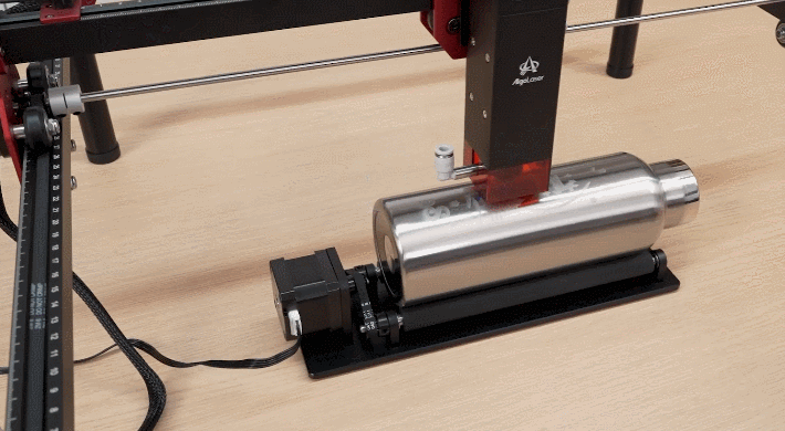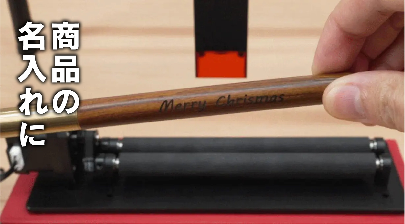 ローラーは筒状なら直径5~100mmのモノまで載せられるので、小さなものならボールペンの名入れに、大きなものならワイングラスの彫刻まで幅広くレーザーで装飾できます。