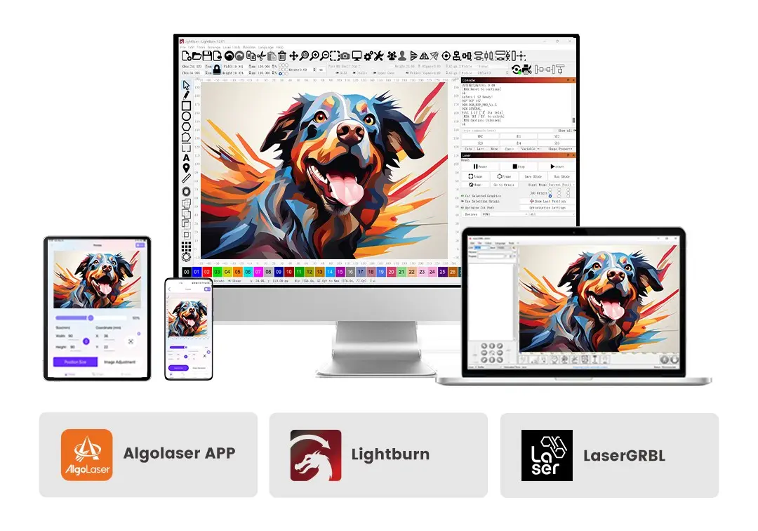 手持ちのパソコンから高度なレーザー彫刻が行える『Lightburn』や『LaserGrbl』といったソフトで直接操作が可能です。
