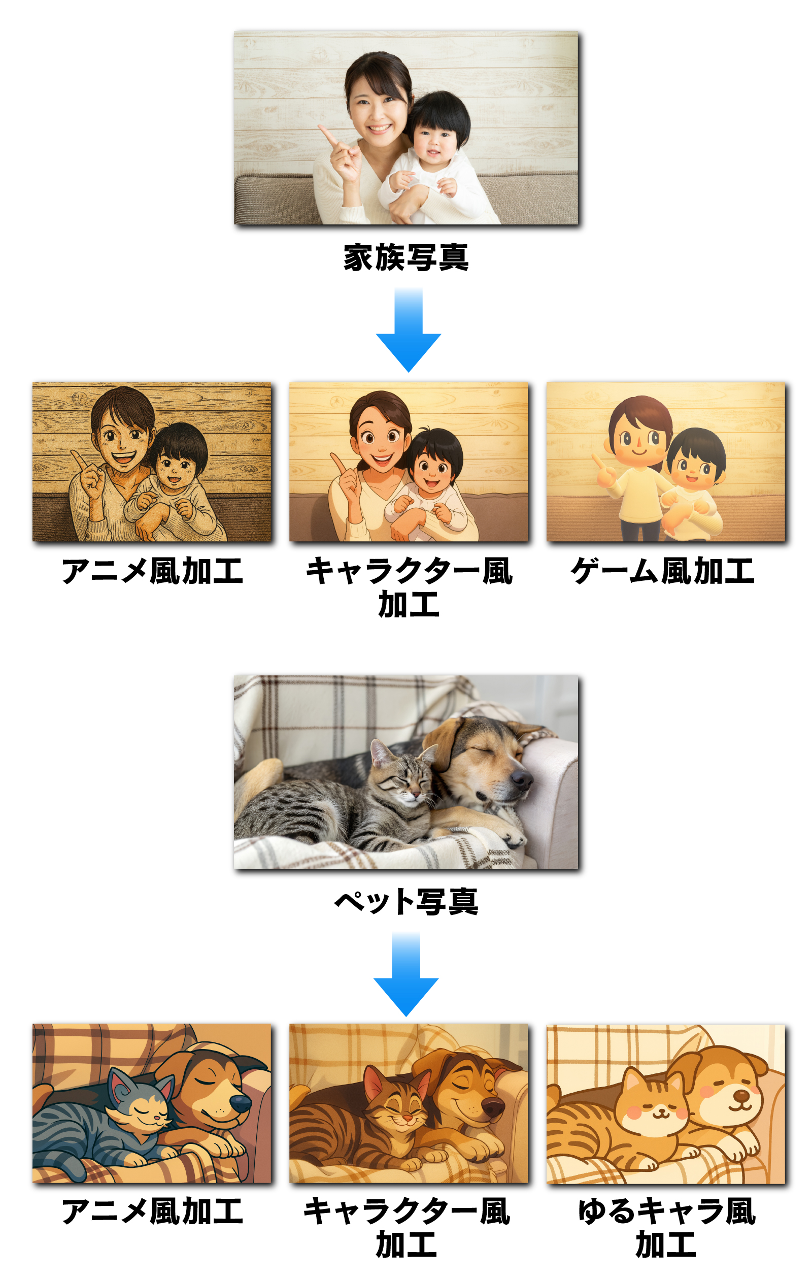 AI画像加工をすると、写真や画像を「アニメ風加工」、「キャラクター風加工」、「ゲーム風加工」のように、あなたの好みに合わせてデザインもできます。
