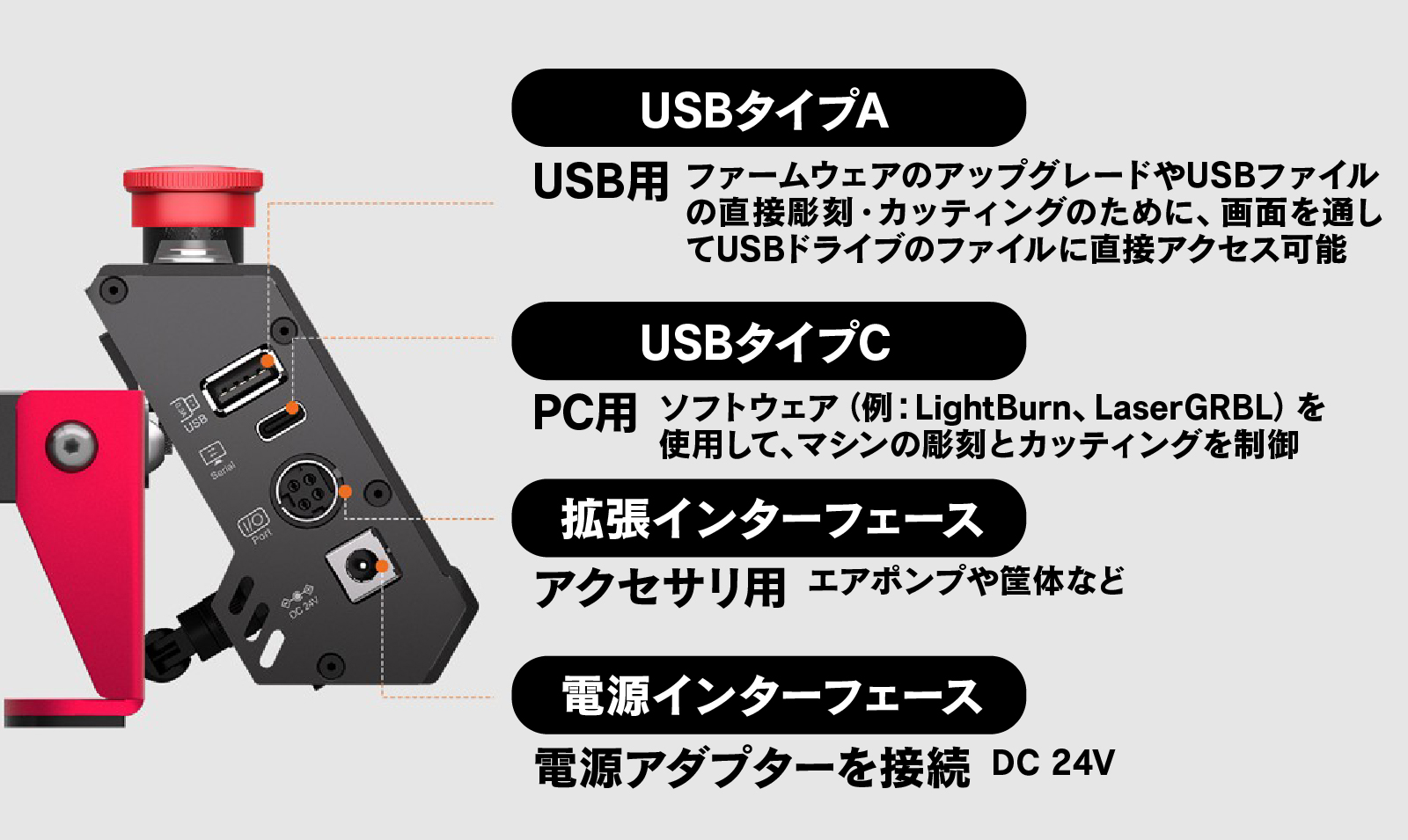 DIY STARTERは初心者でも感覚的に使えるレーザー彫刻機ですが、各種拡張用のインターフェイスを搭載し、様々なモジュールと組みわせてさらに高度なレーザー彫刻が楽しめます。