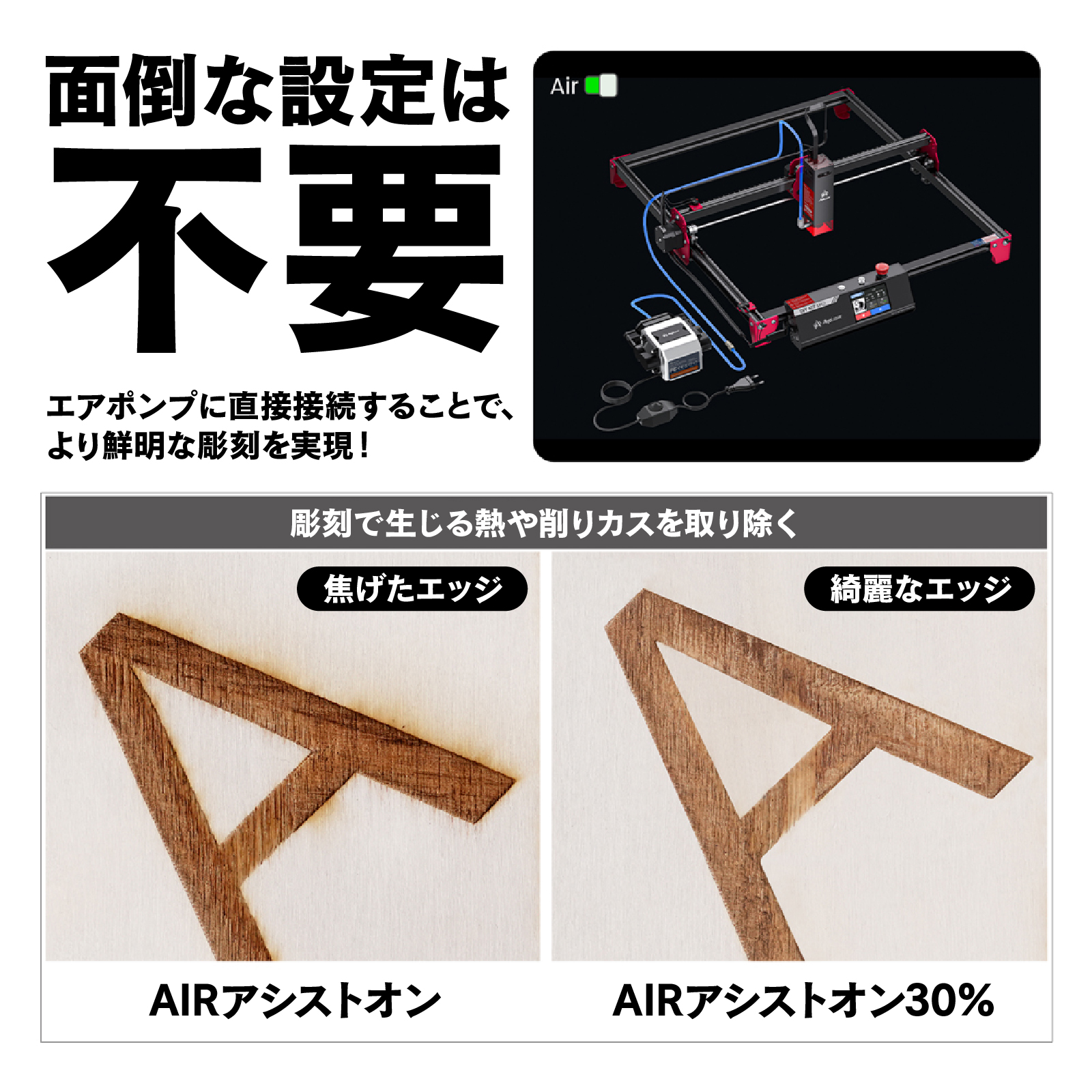 またDIY STARTERはレーザーに取り付けて彫刻で生じる熱や削りカスを取り除く、エアポンプ用の電源コネクターも搭載。