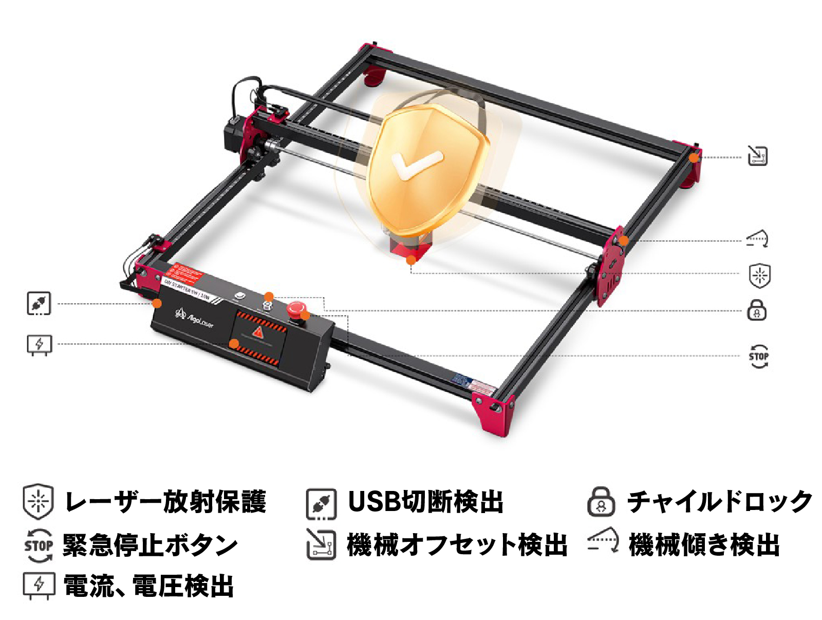 レーザー彫刻では危険なレーザーを扱うため、【DIY STARTER 5W / 10W】では7つの安全装置を搭載。